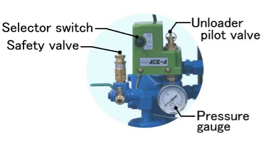 An ACE controller combines the functions of an unloader pilot valve and a pressure switch to allow one-touch switching between continuous and intermittent operation. It also functions as a Safety start/stop switch. When the pressure setting was reached in previous models during intermittent operation, activation of a pressure switch immediately stopped the compressor, exerting a strain on the moving parts and causing partial overheating, leading to excessive wear. In the GK Series with the ACE controller the compressor idles (in a no-load state) for 40 to 50 cycles before stopping, giving the cylinders and other parts a chance to cool down and allowing the moving parts to come to a smooth stop. Starting is also smoother, further reducing piston ring and bearing wear. The result is longer component life and enhanced durability.